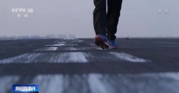 總臺央視記者 李寧:我現(xiàn)在是在海軍艦載航空兵某部,現(xiàn)在已經(jīng)有戰(zhàn)斗機(jī)進(jìn)入飛行甲板,這個甲板是按照航母1:1來建造的。