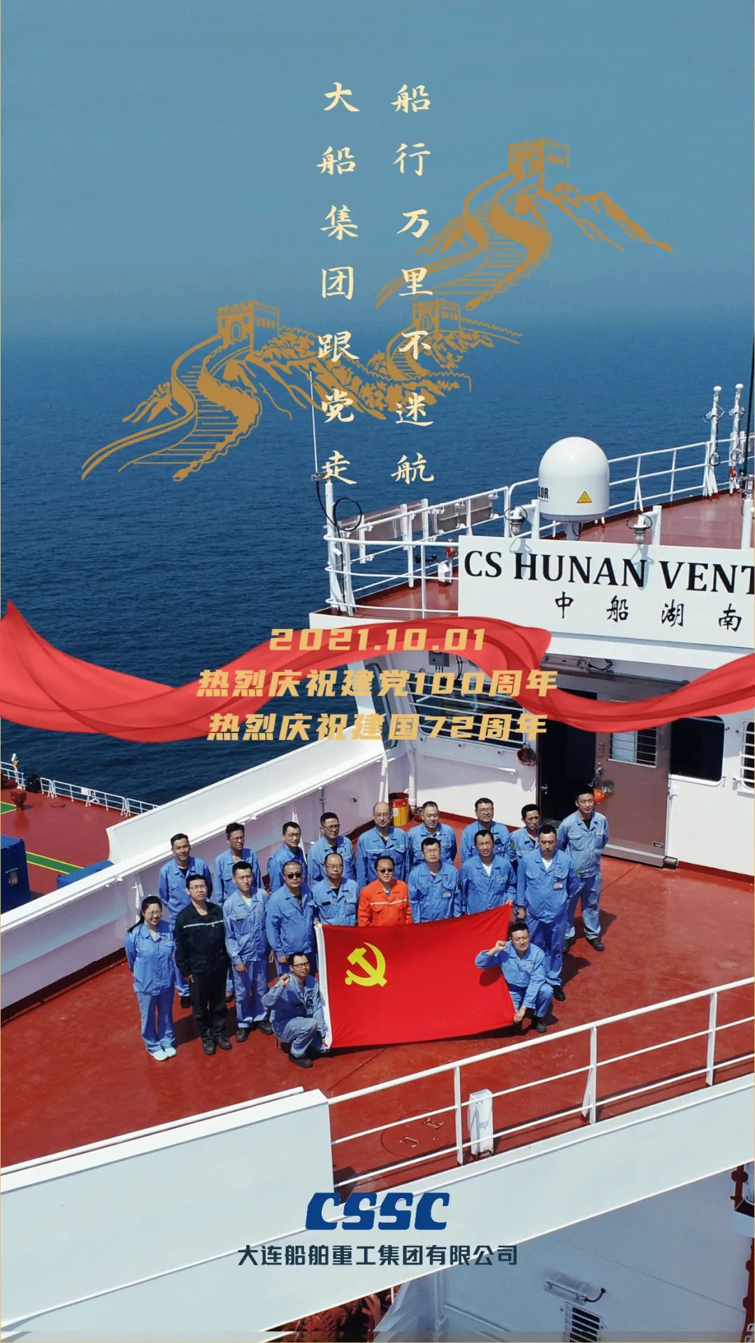 今天,我們迎來(lái)新中國(guó)72周年華誕。作為我國(guó)海軍裝備建設(shè)的主力軍,中國(guó)船舶大船集團(tuán)將不忘初心,牢記使命,堅(jiān)定貫徹海洋強(qiáng)國(guó)、制造強(qiáng)國(guó)、科技強(qiáng)國(guó)國(guó)家戰(zhàn)略,聚焦主責(zé)主業(yè)、聚力興裝強(qiáng)軍,為實(shí)現(xiàn)中華民族偉大復(fù)興的中國(guó)夢(mèng)而不懈奮斗。