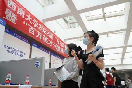 圖片▲在位于重慶市北碚區(qū)的西南大學(xué),應(yīng)屆畢業(yè)生參加“百萬英才興重慶”招聘會(huì)(2022年5月13日攝)。用人單位提供了涉及教育、人工智能、汽車制造等領(lǐng)域的3000多個(gè)崗位供畢業(yè)生選擇。新華社發(fā)(秦廷富 攝)