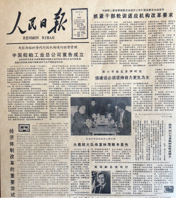 “改革開放是決定當代中國命運的關鍵一招。”1982年5月7日《人民日報》頭版刊載文章:“用經(jīng)濟組織替代行政機構進行經(jīng)營管理——中國船舶工業(yè)總公司宣布成立”,標題下文又著重強調(diào)“以提高經(jīng)濟效益,加速我國船舶工業(yè)為目標,實行工業(yè)與貿(mào)易,軍用品與民用品,造船與修船,科研與生產(chǎn)相結合的方針”。頭版還發(fā)表了以“經(jīng)濟體制改革的重要嘗試”為標題的“社論”。在這期《人民日報》的頭版還刊發(fā)了鄧小平同志接待外賓時的講話“搞建設,必須堅持自力更生為主”。