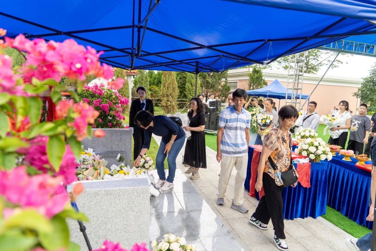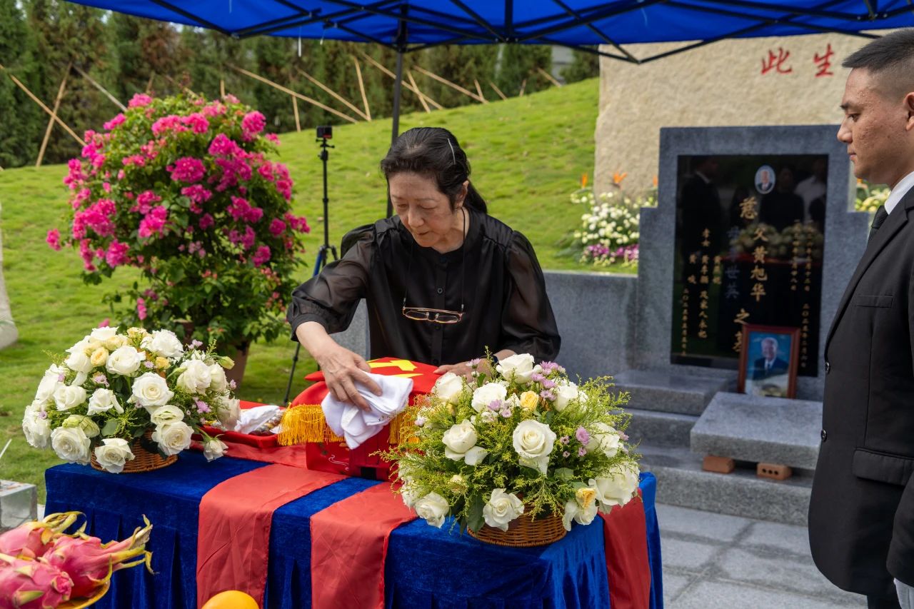 親屬代表擦拭墓碑后,在禮賓人員的引導(dǎo)下將黃旭華院士的骨灰安放進墓穴。人們向黃旭華院士墓碑行三鞠躬禮,并敬獻鮮花,以簡約而莊重的儀式,送別國之脊梁。