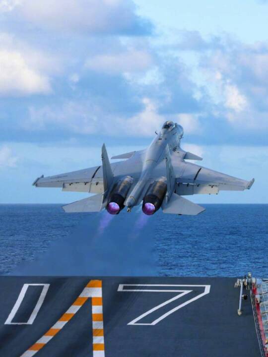 2024年10月,遼寧艦、山東艦編隊(duì)首次開(kāi)展雙航母編隊(duì)演練。殲-15戰(zhàn)機(jī)組成楔形編隊(duì)飛過(guò)雙航母編隊(duì)上空。