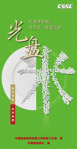 為認(rèn)真貫徹落實(shí)習(xí)近平總書(shū)記關(guān)于制止餐飲浪費(fèi)行為的重要指示精神,大力弘揚(yáng)中華民族勤儉節(jié)約、珍惜糧食的文明用餐習(xí)慣,中國(guó)船舶集團(tuán)積極開(kāi)展“制止餐飲浪費(fèi) 踐行光盤(pán)行動(dòng)”專(zhuān)項(xiàng)宣傳引導(dǎo)活動(dòng)。