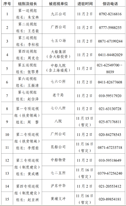 根據(jù)中國(guó)船舶集團(tuán)黨組對(duì)2020年第二輪巡視工作的統(tǒng)一部署,截止11月2日,集團(tuán)公司黨組7個(gè)常規(guī)巡視組已全部完成進(jìn)駐,對(duì)九江公司、廣西公司、七五〇場(chǎng)、大船集團(tuán)(含大船投資)、中船九院(含上海瑞苑)、七六〇所、老干局等7家單位開(kāi)展常規(guī)巡視。集團(tuán)公司黨組4個(gè)專(zhuān)項(xiàng)巡視組采取“一托二”方式同步對(duì)七〇八所、八院、廣州公司、昆船公司、中船物資、七二五所、滬東中華、黃埔文沖等8家單位開(kāi)展扶貧領(lǐng)域、制度建設(shè)專(zhuān)項(xiàng)巡視,4個(gè)專(zhuān)項(xiàng)巡視組目前均已進(jìn)駐首家被巡視單位。