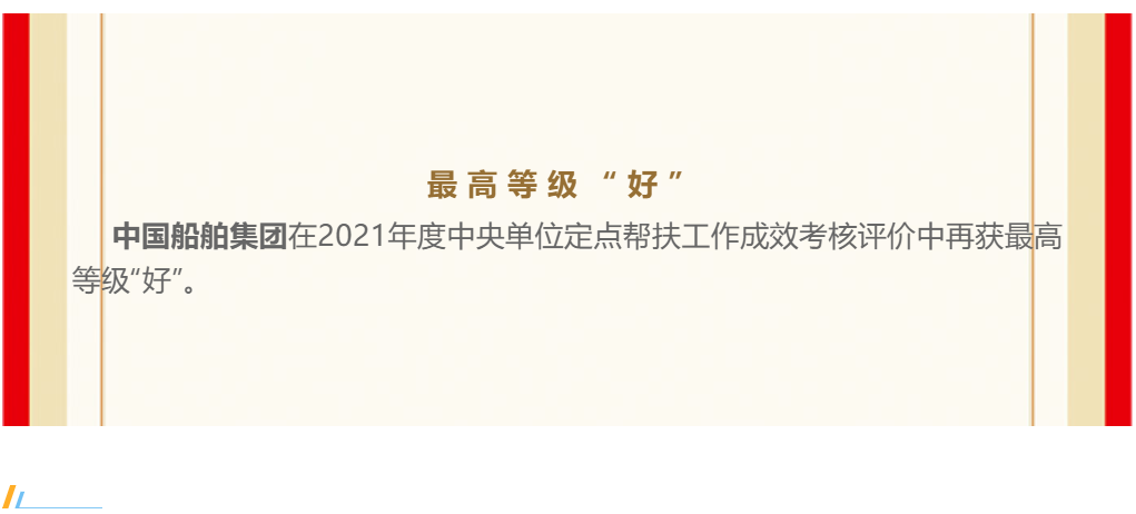 近日,中國船舶集團(tuán)在2021年度中央單位定點(diǎn)幫扶工作成效考核評(píng)價(jià)中再獲最高等級(jí)“好”。這是自2019年組建成立以來,中國船舶集團(tuán)連續(xù)第三年獲“好”。