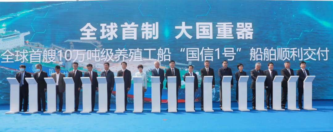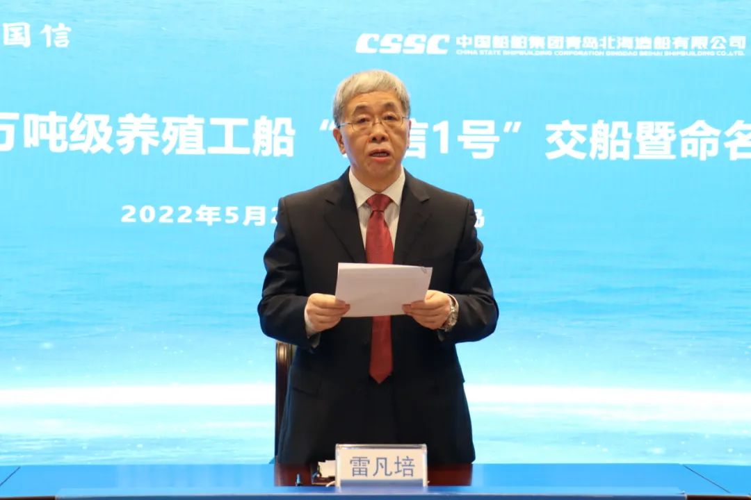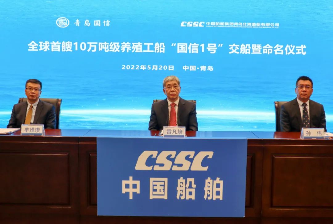 5月20日,中國船舶集團(tuán)旗下青島北海造船有限公司為青島國信發(fā)展(集團(tuán))有限責(zé)任公司建造的全球首艘10萬噸級(jí)智慧漁業(yè)大型養(yǎng)殖工船“國信1號(hào)”交船命名儀式在青島舉行。中國船舶集團(tuán)黨組書記、董事長雷凡培,黨組成員、副總經(jīng)理孫偉通過視頻出席儀式,山東省人民政府黨組成員、副省長凌文,青島市委副書記、市長趙豪志,中國海洋大學(xué)黨委副書記、校長于志剛,中國工程院院士麥康森等領(lǐng)導(dǎo)和嘉賓出席儀式。青島市副市長趙燕為新船命名。
