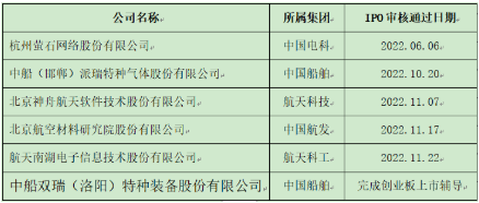 2022年的資本市場(chǎng),行情不熱行業(yè)熱。從已經(jīng)公開(kāi)披露的信息看,2022年中央企業(yè)專(zhuān)精特新小巨人在科創(chuàng)板和創(chuàng)業(yè)板持續(xù)發(fā)力,目前已有中無(wú)人機(jī)(航空工業(yè))、國(guó)博電子(中國(guó)電科)、振華風(fēng)光(中國(guó)電子)、昆船智能等7家企業(yè)IPO上市。此外,截至2022年11月30日,已有多家央企專(zhuān)精特新企業(yè)IPO申請(qǐng)通過(guò)了科創(chuàng)板上市委審核和創(chuàng)業(yè)板上市輔導(dǎo),其中有兩家中國(guó)船舶集團(tuán)旗下企業(yè)(見(jiàn)下表)。這些企業(yè)將在2023年IPO上市,主要來(lái)自船舶、航空、航天和軍工電子行業(yè)。
