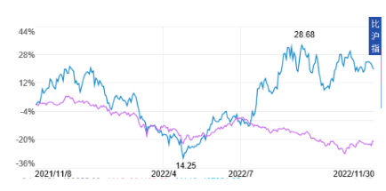 很顯然,中船系憑其創(chuàng)新和產(chǎn)業(yè)鏈優(yōu)勢(shì)已成為中國(guó)資本市場(chǎng)一股新生力量。中國(guó)船舶集團(tuán)龍頭股中國(guó)船舶(600150)2022年11月30日收盤(pán)價(jià)比去年同期上漲約20%,跑贏(yíng)大市。下圖為2022年11月30日中國(guó)船舶與滬深300指數(shù)漲跌對(duì)比圖,上部曲線(xiàn)為中國(guó)船舶,下部曲線(xiàn)為滬深300。