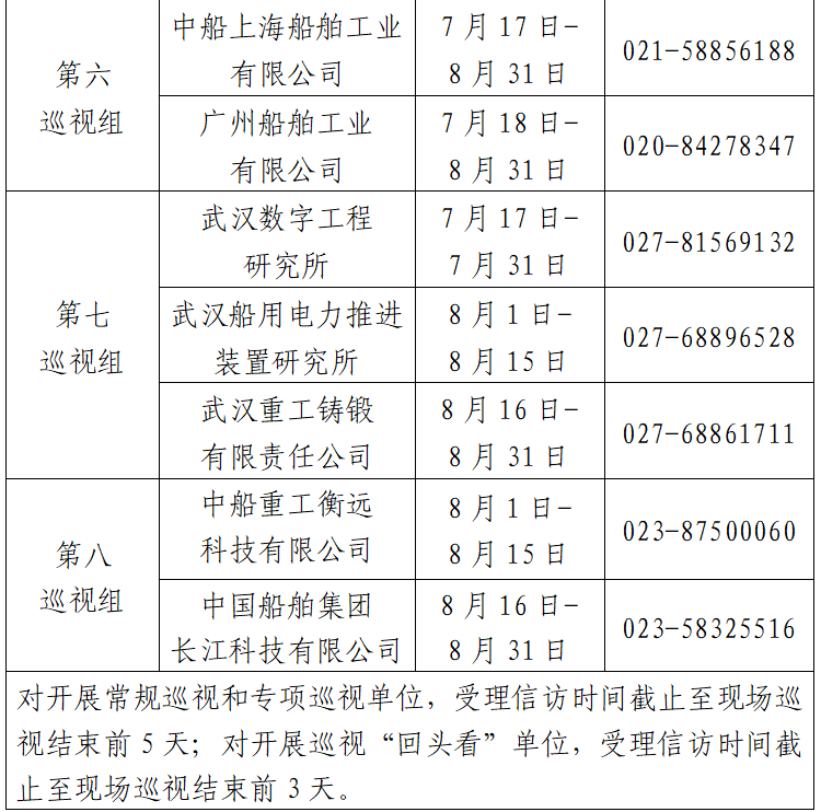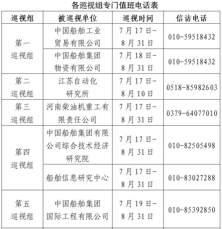 根據(jù)中國船舶集團(tuán)黨組2023年第一輪巡視工作部署,截至2023年7月17日,巡視工作已經(jīng)鋪開。其中,對中國船舶工業(yè)貿(mào)易有限公司、中國船舶集團(tuán)物資有限公司、江蘇自動(dòng)化研究所、河南柴油機(jī)重工有限責(zé)任公司、中國船舶集團(tuán)有限公司綜合技術(shù)經(jīng)濟(jì)研究院、船舶信息研究中心、中國船舶集團(tuán)國際工程有限公司等7家單位開展常規(guī)巡視,對中船上海船舶工業(yè)有限公司、廣州船舶工業(yè)有限公司等2家單位開展專項(xiàng)巡視,對武漢數(shù)字工程研究所、武漢船用電力推進(jìn)裝置研究所、武漢重工鑄鍛有限責(zé)任公司、中國船舶集團(tuán)長江科技有限公司、中船重工衡遠(yuǎn)科技有限公司等5家單位開展巡視“回頭看”。