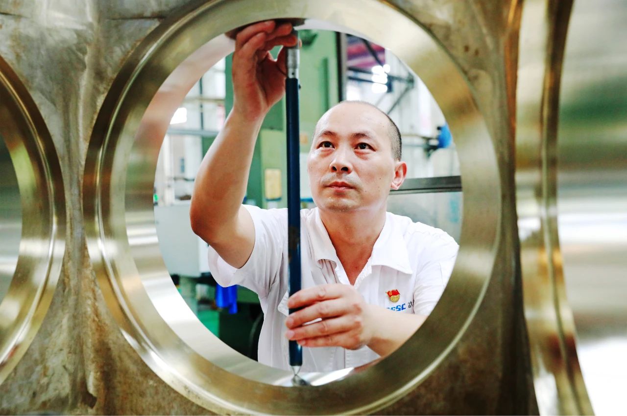 在武漢船機(jī)平臺(tái)生產(chǎn)現(xiàn)場,一名機(jī)床操作師傅,正在對(duì)加工后的零件進(jìn)行檢測,專注的表情展現(xiàn)了船舶人嚴(yán)把質(zhì)量關(guān),人品以誠心為本,企品以恒心為要,產(chǎn)品以匠心為重的精神風(fēng)貌。