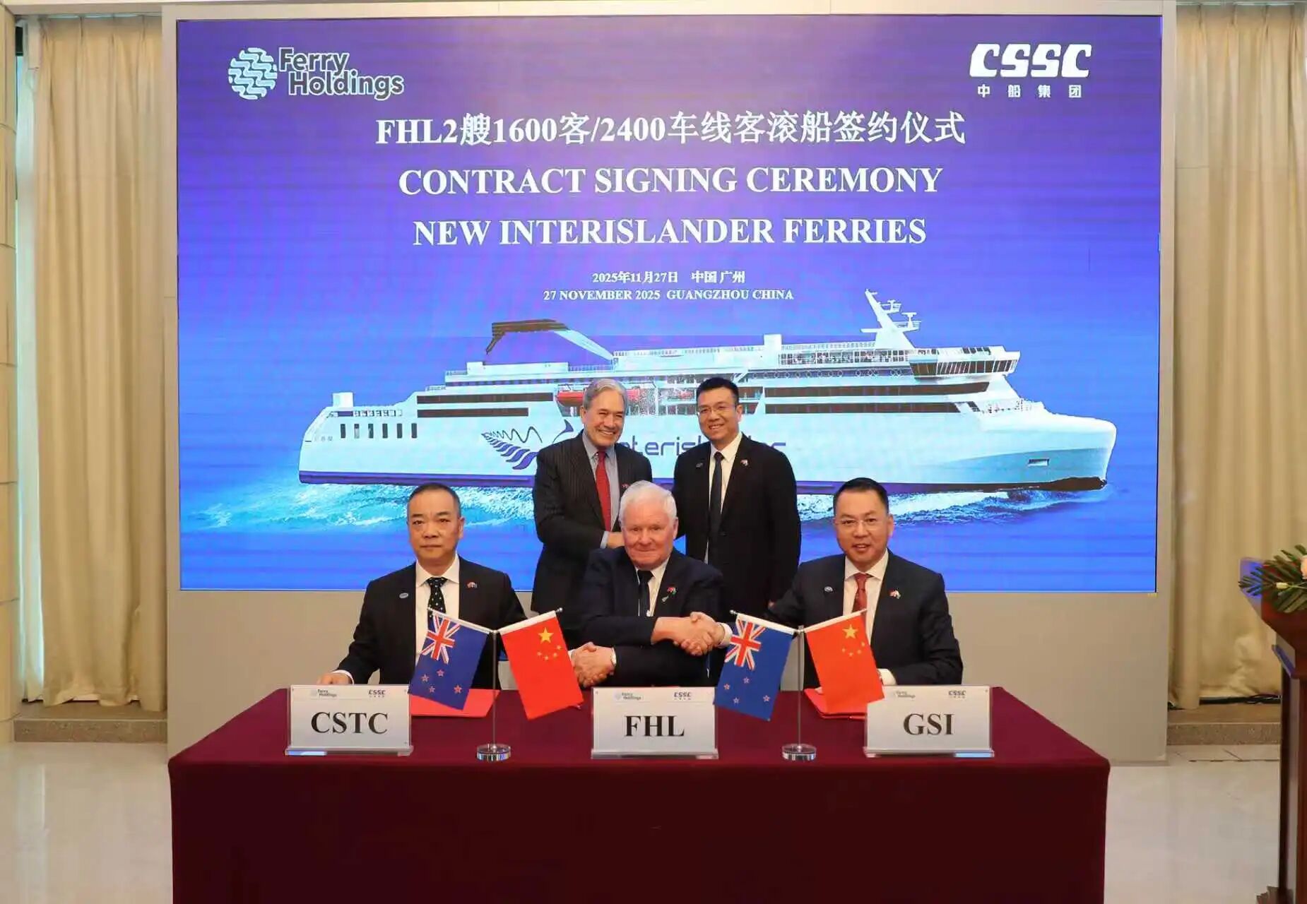 11月27日,中國船舶集團(tuán)有限公司旗下廣船國際有限公司攜手新西蘭FHL(Ferry Holdings)公司簽署2艘新型客滾船建造合同。當(dāng)天簽約的客滾船項(xiàng)目,是連接中新兩國友誼的重要紐帶。在中船集團(tuán)與FHL公司攜手推動(dòng)下,雙方共贏合作邁出了關(guān)鍵一步。