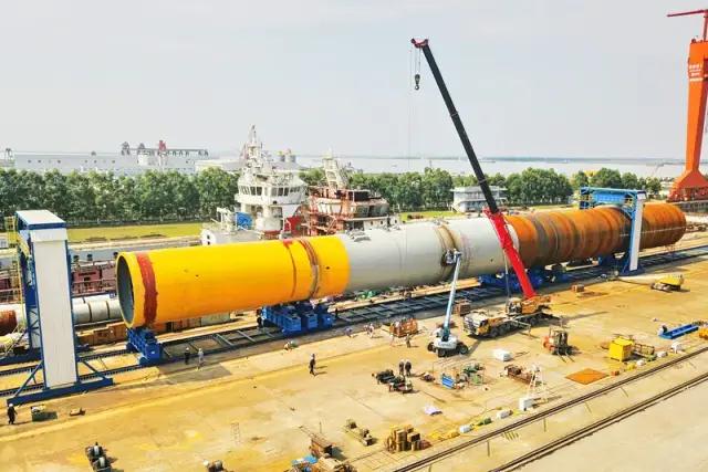 ???日前剛向大家介紹了中國(guó)船舶集團(tuán)旗下黃埔文沖建造的單樁穩(wěn)樁平臺(tái)主體工程順利成型,就在昨天又交付一海上風(fēng)電產(chǎn)品海上風(fēng)電單樁。4月14日,黃埔文沖船舶下屬文船重工公司交付了為保利長(zhǎng)大工程有限公司建造的首個(gè)海上風(fēng)電單樁。該單樁直徑8.8米,長(zhǎng)103.4米,最大板厚85毫米,重1644.3噸,已經(jīng)達(dá)到一艘輕型護(hù)衛(wèi)艦的重量,是目前世界上最大的風(fēng)電單樁之一。
