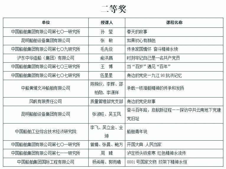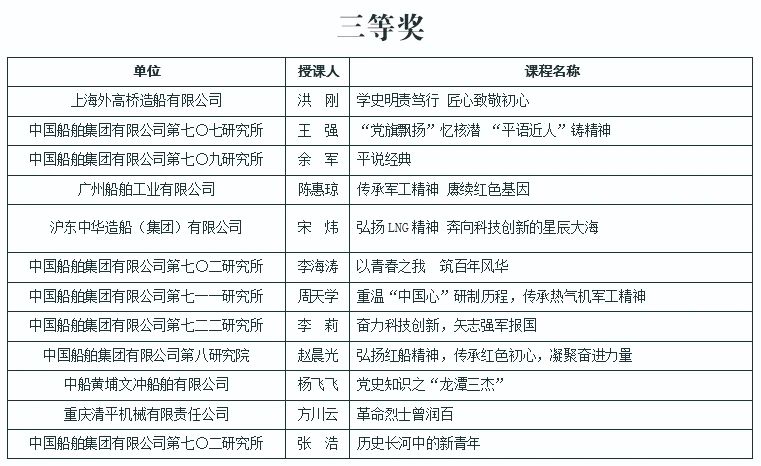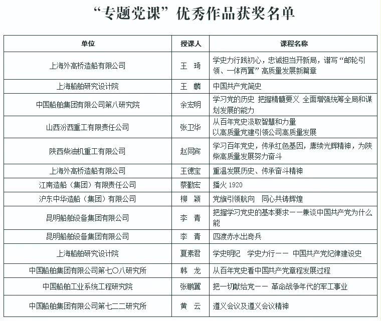 為慶祝中國共產(chǎn)黨成立100周年,深入推進黨史學(xué)習(xí)教育,由中國船舶集團黨群工作部主辦,中國船舶集團黨校承辦的慶祝中國共產(chǎn)黨成立100周年黨課評選活動結(jié)果今天正式揭曉。